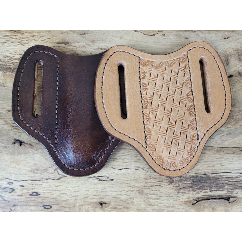 A Pancake style knife sheath for the large Case Trapper knife (4.125 in.) The sheath fits up to 1.5 in. belt and is available in 4 color options. Made with full grain veg tan leather, this durable sheath will hold your knife secure in any situation. Choose your color and thread combination. Made to order. Please allow 3 to 4 days for manufacture of your sheath. *Knife not included.